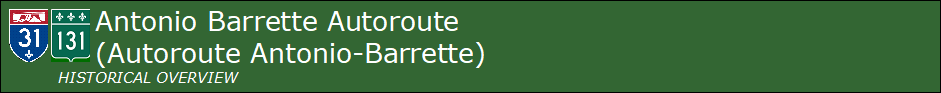 A-31 was substantially completed by 1966, but did not fully open to traffic until 1967, when the initial section of the North Shore Autoroute (A-40) was opened to traffic. It is signed with QC 131 along its entire length. In 1999, A-31 was renamed the "Antonio Barrette Autoroute" in honor of the one-time Quebec premier.
