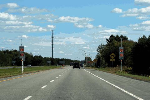 (SLOWING) DOWN ON THE FARM: Although A-31 is designed to freeway standards, farm machinery is permitted on the southernmost two kilometers (1.2 miles) of the freeway. The province granted this allowance to allow farm equipment to cross over A-40 safely; the A-31 / QC 131 overpass is the only crossing of A-40 over a 16-kilomter (10-mile) distance. For years, the MTQ posted a fixed maximum speed limit of 90 km/h (56 MPH), and a fixed minimum of 30 km/h (18 MPH). In 2008, the MTQ installed a new farm machinery detection system with electronic variable speed limit signs. These speed limit signs, which have a default of 100 km/h (62 MPH) maximum and 60 km/h (37 MPH) minimum, adjust automatically to 80 km/h (50 MPH) maximum and 30 km/h (18 MPH) minimum when a farm vehicle is detected.
